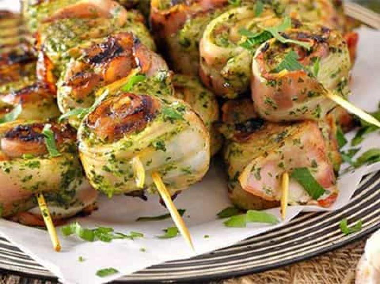 - Չափաբաժինները` 4-6: Այս խորովածի համի գաղտնիքը մարինադի և (համեմն ու սխտորը հիանալի համադրություն են) հում ապխտած բեկոնի մեջ է։ Միսը 2 սմ լայնությամբ, մոտ 1 սմ հաստությամբ և 8-10 սմ երկարությամբ կտրատում ենք և դնում մեծ ամանի մեջ։ Կանաչին, մանր քերիչով անցկացրած սխտորը, բուսայուղը լցնում ենք բլենդերի մեջ և հարում ենք մինչև համասեռ զանգված ստանանք։