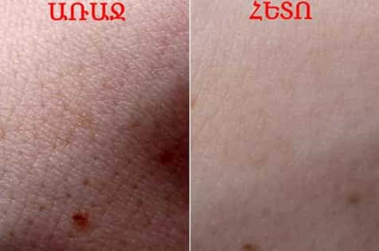 - Մաշկը ծածկել այս խառնուրդով և մի քանի վայրկյան մեղմ ու շրջանաձև շարժումներով մերսել մաշկը։