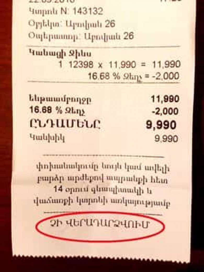 Ինչ վերաբերվում է ՀԴՄ կտրոնի վրա «գնված ապրանքը ետ չի ընդունվում» գրելուն և սեփական խանութի օրենքների մասին խոսելուն, դա օրենքի կրկնակի խախտում է: Նման բան ՀԴՄ կտրոնի վրա գրելու իրավունք չկա: Այդ հայտարարություններով տնտեսվարողը մոլորեցնում և խաբում է այն սպառողներին, ովքեր լիարժեք չեն տիրապետում իրենց իրավունքներին։ Այս դեպքում կարգապահական վարույթ կարող է սկսել նաև տնտեսական մրցակցության պաշտպանության պետական հանձնաժողովը: Սպառողը պետք է դիմի այդ հանձնաժողովին»։