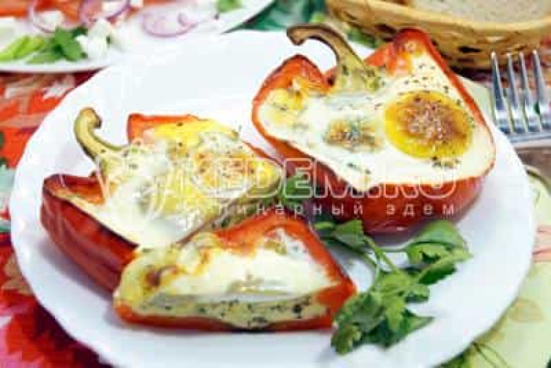 Լցնել պղպեղի մեջ, ձուն ջարդել, ավելացնել աղ, պպեղ ու դնել ջեռոց 15 րոպե 200 աստիճանով:
