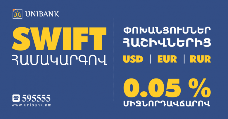 Taking the clients’ demands into consideration, UNIBANK runs a new promotion in the frameworks of which it offers affordable tariffs for the most popular destinations of SWIFT money transfers. In particular, transfers from USD, EUR and RUB accounts are made at 0.05% tariff. If a client provided an average of AMD 15 million or more daily balance on his current account during the last month or made conversions of USD 50 000 or more, than transfers from USD, EUR and RUB accounts are made fee free.