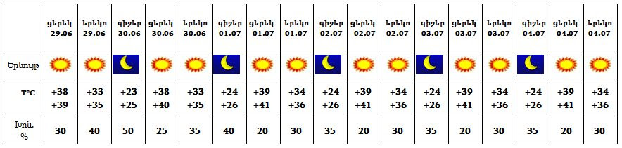 Հունիսի 29-ի ցերեկը, 30-ին, հուլիսի 1-4-ը սպասվում է առանց տեղումների եղանակ: