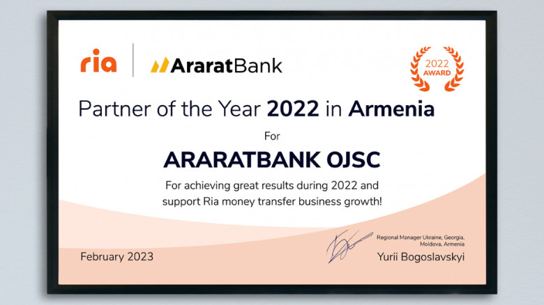 SOCIETYRia Money Transfer once again named AraratBank Partner of the Year 2022.