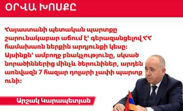 «Համահայկական ճակատ» շարժման առաջնորդ, պաշտպանության նախկին նախարար Արշակ Կարապետյանն էլ նշում է, թե ՀՀ ողջ բնակչությունը՝ նորածիններից մինչև ծերունիներ մոտ 7 հազար դոլարի չափով պարտք ունեն։ Հանրության մեջ ճանաչում ու հեղինակություն ունեցող մարդիկ պարբերաբար արձանագրում են այս փաստերը, բայց կարծես ոչինչ չի եղել։