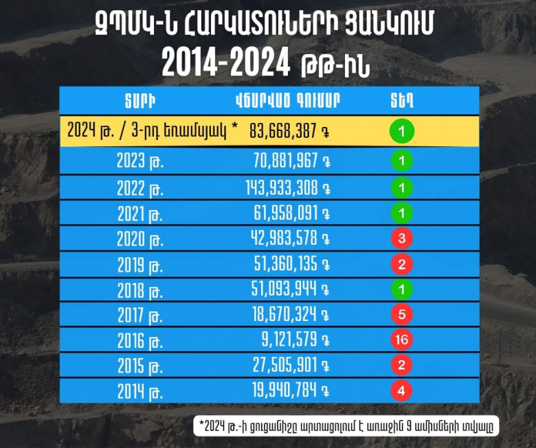 Ընթացիկ տարվա հունվար-սեպտեմբեր ամիսներին կոմբինատը վճարել է 83,668,387 հազար դրամ հարկ։ Նշենք նաև, որ ԶՊՄԿ-ն արդեն գերազանցել է 2023թ․ ընթացքում իր կողմից վճարված հարկերի տարեկան ցուցանիշը (70,881,967 հազար դրամ)։