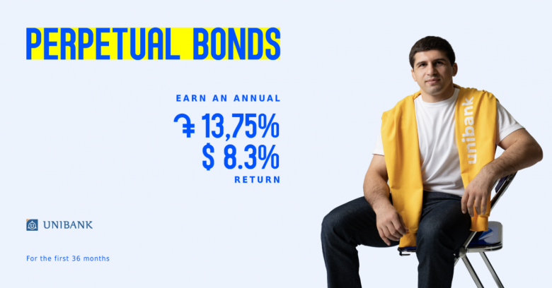 ECONOMICSUnibank announces the placement of the first perpetual bonds in the Armenian market, with a total volume of AMD 3.5 billion and USD 9 million. The coupon yield is set at 13.75% per annum for the AMD-denominated bonds and 8.3% per annum for the USD-denominated bonds.