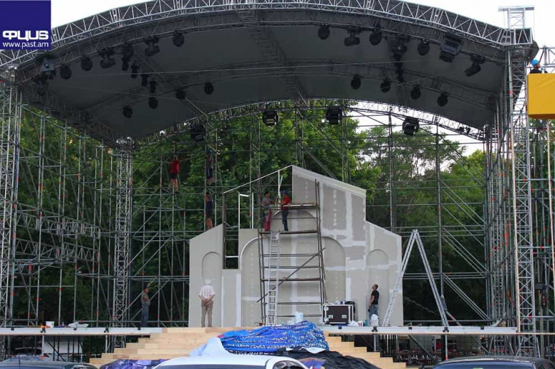 PHOTOՀունիսի 24-ին Հռոմի պապի Հայաստան այցելելու կապակցությամբ Հանրապետության հրապարակում եկեղեցանման ժամանակավոր կառույց են տեղադրում։