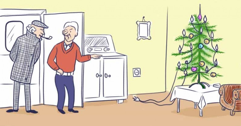 Ответ: В елочной гирлянде не хватает одной лампочки, а без нее украшение не будет светиться. Хозяин действительно впопыхах наряжал елку перед уходом и не проверил исправность гирлянды. Сосед же не мог этого знать и наврал, что пел песни под сверкающей разноцветными лампочками елкой.