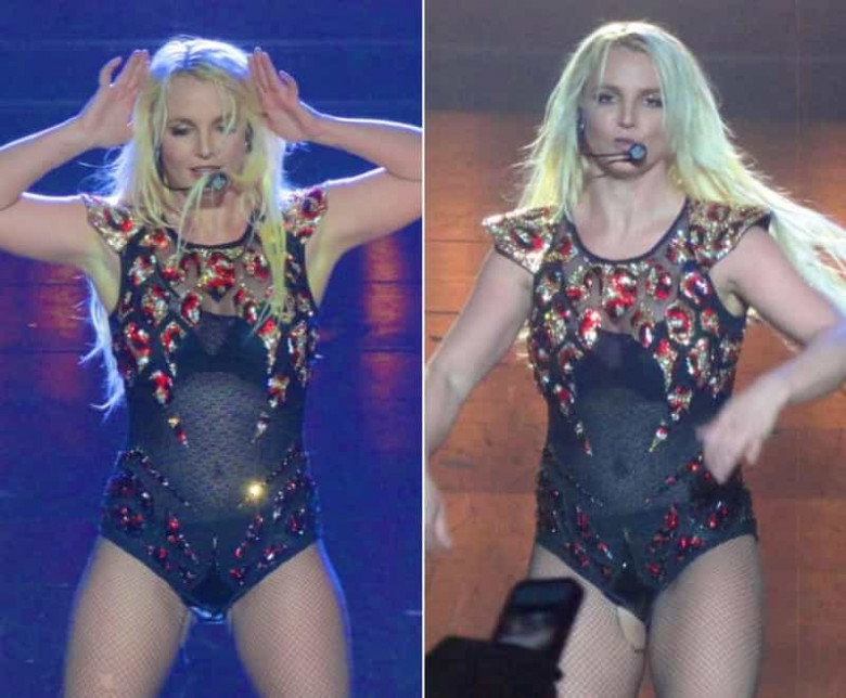 Одна вещь, которую мы можем с уверенностью сказать о Бритни — она никогда не стесняется носить откровенные и весьма скудные наряды. Обнажаясь по привычке, она словно забывает, что ее тело уже не то, что до рождения детей. Многие из увидевших эти фотографии пользователей сети недоумевали: зачем выставлять свое тело в столь неприглядном свете? Во время одного из выступлений на Спирс был черный кожаный комбинезон с открытым верхом, во время другого — бюстгальтер и шорты. Все бы ничего, но наряд оказался слишком облегающим и показал фигуру звезды не в лучшем виде. Впрочем, в последние годы певица регулярно ошибается с выбором концертных костюмов. Слишком открытые наряды, которые предпочитает Бритни, подошли бы молодой и стройной девушке, но никак не 33-летней матери двоих детей. Все знают и ценят тот факт , что Бритни — настоящая женщина, с телом реальной женщины. Но это не означает , что она должна носить одежду, показывающую намного больше, чем нам хотелось бы видеть, как на этом фото.