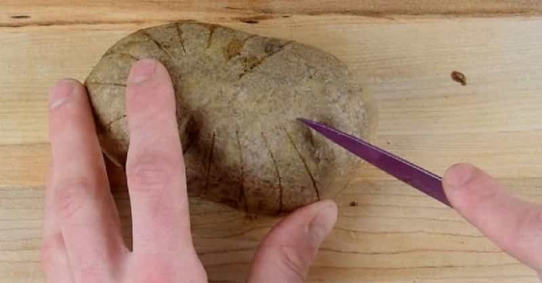 - Срежь небольшой слой клубня так, как показано на фото. По бокам сделай несколько вертикальных надрезов.