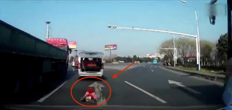 В Китае на довольно оживленной трассе из задней двери микроавтобуса на дорогу выпал 2-летний малыш. После падения ребенок встал и побежал вслед за уезжающей машиной, шатаясь по многополосной дороге из стороны в сторону, пугаясь проезжающего мимо транспорта.