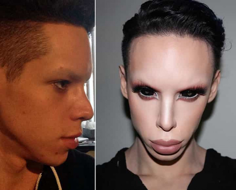 Он начал свои манипуляции с наполнителей для губ в возрасте 17 лет, затем сделал две ринопластики, ввел наполнители в щеки, брови и другие места.