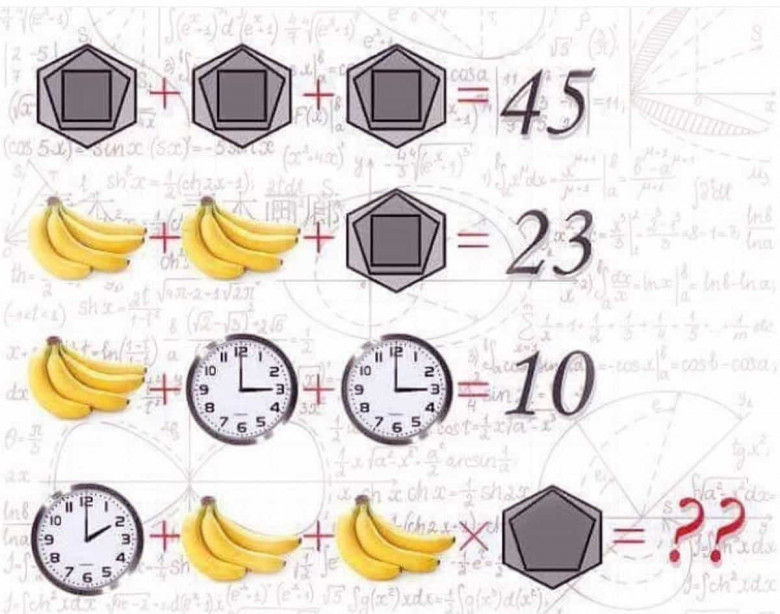 На самом деле логика автора задачи такова. Каждый банан по отдельности равен единице. Каждый угол у многоугольника — тоже. И время на часах тоже обозначает нужное число! В конечном итоге всё сводится к уравнению: