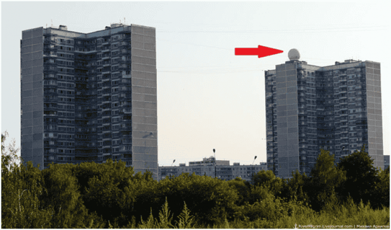 В действительности картина гораздо прозаичнее. Белый шар – сферическое покрытие для защиты разного рода антенн. Устанавливаемые на многоэтажках, они в большинстве случаев представляют собой метеорадары для наблюдения за погодой.