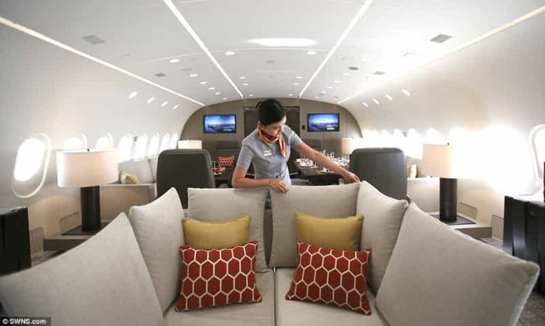 Через большие окна каюты виднеются небесные просторы, здесь расположены 18 лежачих мест первого класса, а также зал для отдыха и проведения собраний. Предусмотрена также отдельная комната для уединения, выделены помещения для кабин экипажа. Давление в салоне самолета специально поддерживается на комфортном для пассажиров уровне.