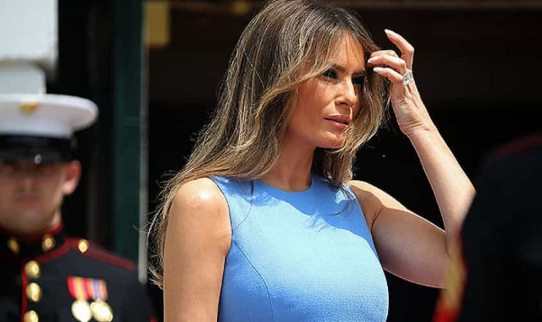 Для официального приема Мелания выбрала платье-футляр небесно-голубого цвета одного из ее любимейших брендов — Michael Kors. К слову, именно этот оттенок голубого цвета особо нравится миссис Трамп: вспомним хотя бы ее платье на инаугурации супруга.
