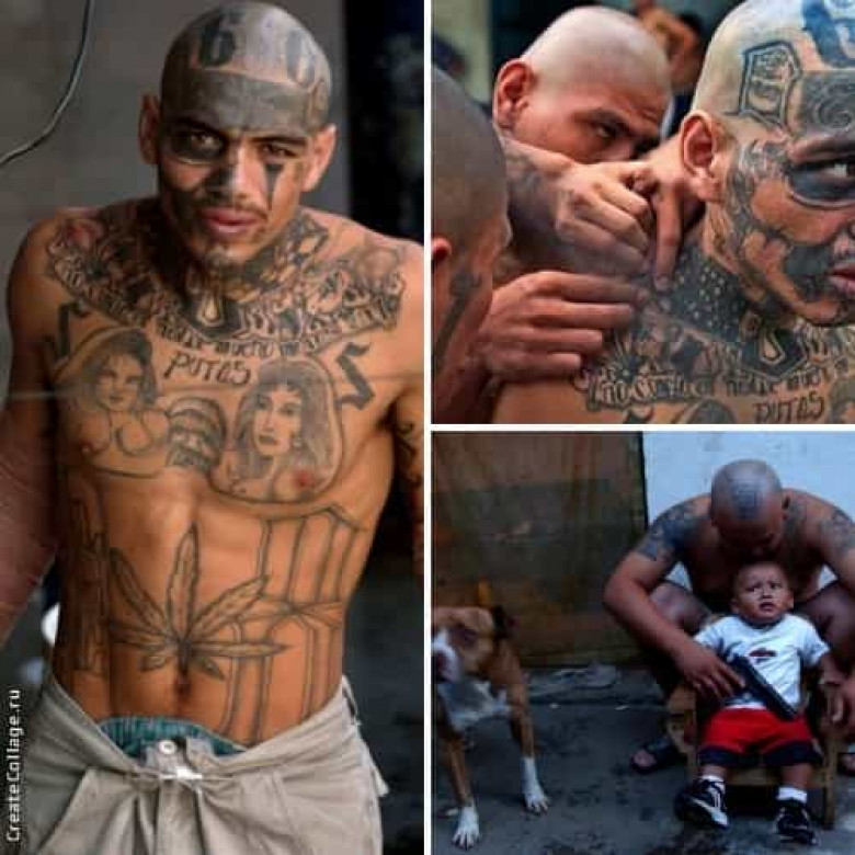 Татуировки на голове и лице есть у всех членов банды. Это не просто бандитское украшение, а набор тайных знаков, рассказывающих о личных качествах человека, его биографии и месте в иерархии MS-13. Впрочем, в последнее время главари банды призывают молодежь отказываться от тату на лице - слишком легко по нему опознать преступника.
