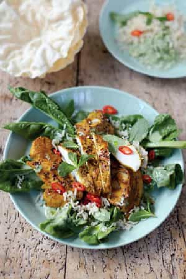 Откиньте готовый рис на дуршлаг, сохранив немного воды от варки в кастрюле, установите дуршлаг на кастрюлю, накройте и поставьте на слабый огонь, чтобы рис не остыл. По одной приготовьте в микроволновке лепешки, по 30 секунд каждую. Нарежьте курицу и разложите ее по тарелкам вместе с цветной капустой, рисом, шпинатом и лепешками. Полейте мятной заправкой, посыпьте колечками чили и мелкими листиками мяты — и приступайте!