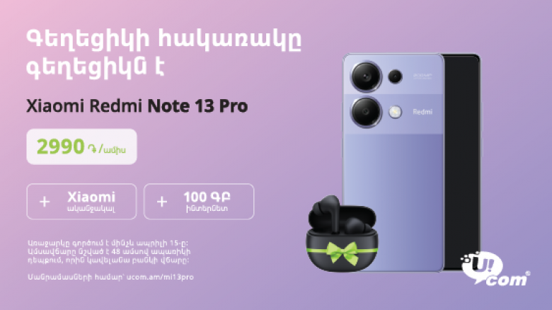 С 4 марта по 15 апреля только в центрах продаж и обслуживания Ucom абоненты смогут приобрести смартфоны Xiaomi Redmi Note 13 Pro, ежемесячно выплачивая 2990 драмов. Вместе с смартфоном каждый покупатель получит беспроводные наушники Xiaomi Redmi и красивый номер со включенным пакетом Level Up 1800. Первый месяц использования тарифного плана будет бесплатным, также с каждым номером будет предоставлено 100 ГБ интернета, которые будут доступны в течение 6 месяцев. Полная стоимость смартфона составит 143.500 драмов.