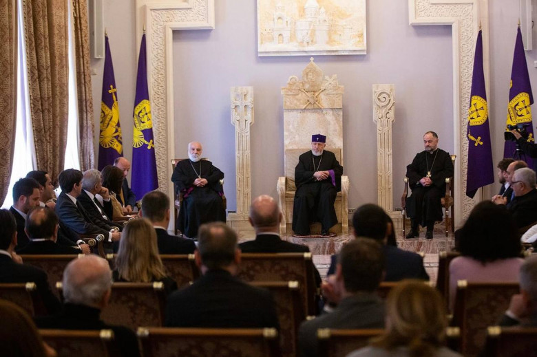 На встрече присутствовал также посол Франции в Армении Оливье Декоттиньи. Поприветствовав гостей и отметив многовековую армяно-французскую дружбу, Католикос выразил признательность властям Франции за заботливое отношение к армянам, пережившим Геноцид армян, а также за поддержку, оказанную Армении в эти трудные времена.