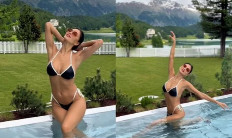 Певица выглядела невероятно в треугольном купальнике-двойке с белой отделкой и завязками по бокам, купаясь в роскошном бассейне.
