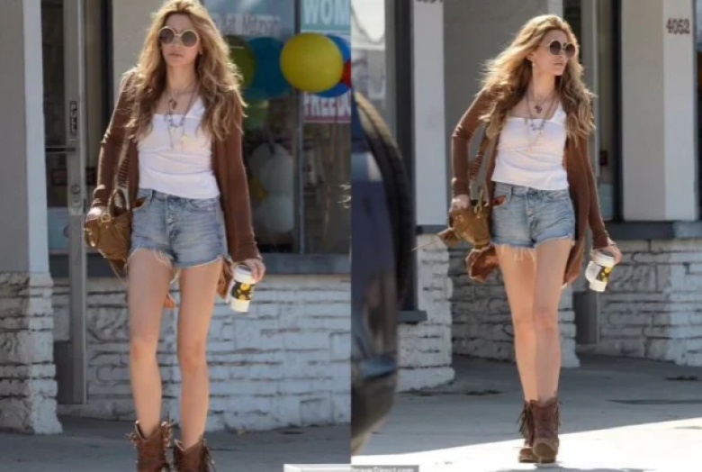 Дочь Майкла Джексона, 26-летняя певица показала свои стройные ноги в джинсовых шортах и коричневых кожаных ботильонах с кисточками. Она дополнила образ несколькими ожерельями и парой больших круглых солнцезащитных очков в золотой оправе.