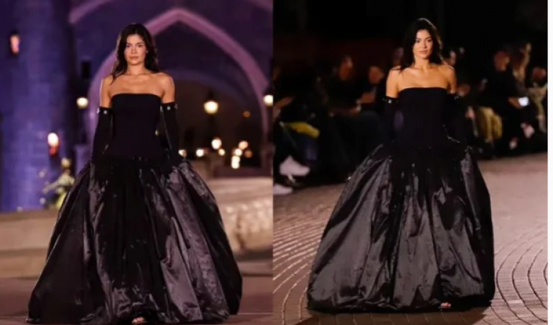 Дженнер прошла по подиуму, установленному перед замком Спящей красавицы, в черном бальном платье и оперных перчатках, вызывая ассоциации с королевской особой из сказки.