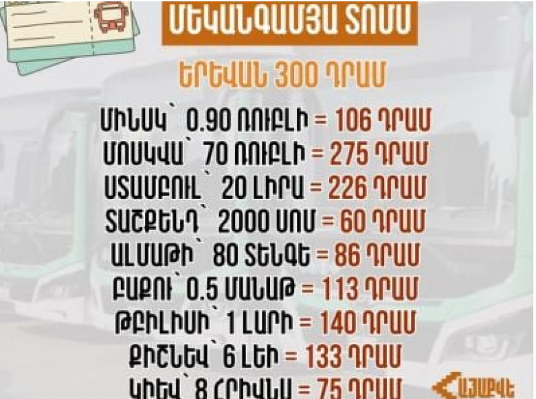 Согласно таблице, опубликованной «Айакве», цены в иных городах следующие: Минск – 106, Москва – 275, Ташкент – 60, Анталия – 86, Баку – 113 драмов, Стамбул – 226».