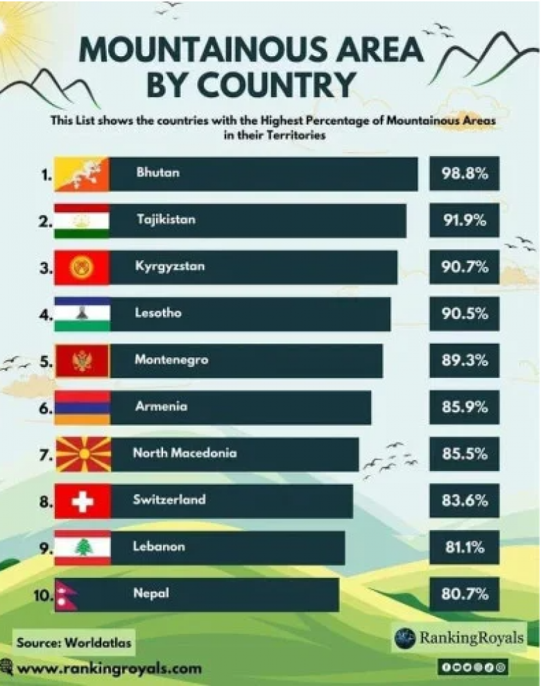 Армения в рейтинге заняла шестое место с 85,9% горной местности.