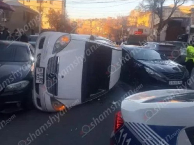 Около 17:30 на улице Чаренца столкнулись автомобили «Honda», за рулем которого находился 30-летний житель Гегаркуникской области Ваан Барсегян, «BMW», за рулем которого находился 44-летний житель Арсен Багдасарян и «Mercedes», за рулем которого находился 20-летний житель Еревана Давид Мартиросян. Вследствие столкновения последний автомобиль перевернулся.