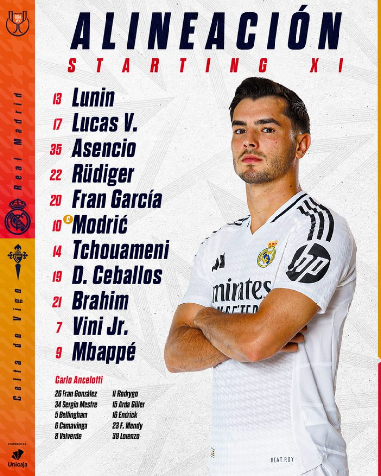 «Реал»: Лунин, Асенсио, Лукас Васкес, Рюдигер, Фран Гарсия, Себальос, Тчуамени, Модрич, Браим, Винисиус Жуниор, Мбаппе.