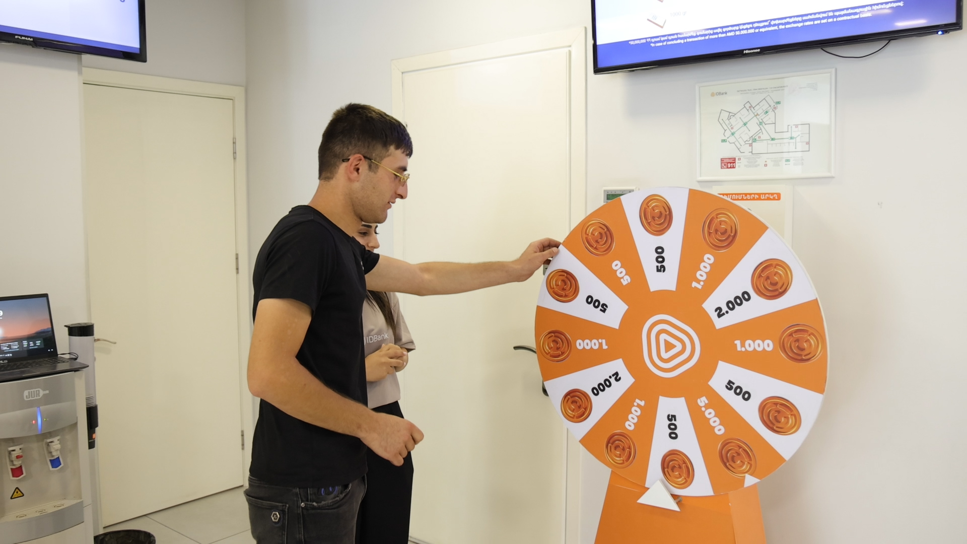 Гостей филиала угощали сладостями, а также они крутили колесо удачи и выигрывали idcoin-ы, которые можно было использовать при оплате с помощью Idram QR.