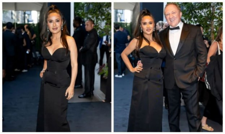 Образ актрисы завершали подвесные бриллиантовые серьги, несколько колец с драгоценными камнями и эффектная причёска — полувысокий хвост на макушке с распущенными локонами. Макияж Сальмы был в её фирменном стиле: коричневая подводка и тени, бронзово-персиковый румянец и нюдовая помада, подчёркивающая естественное сияние кожи.