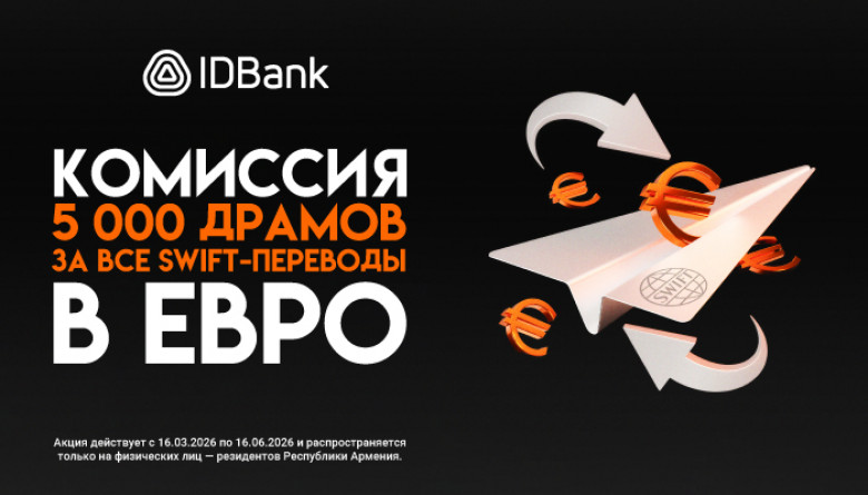 В рамках кампании комиссия за отправку международных SWIFT-переводов в евро установлена в размере всего 5 000 драмов РА, независимо от суммы перевода и направления перевода, приемлемого для Банка. Предложение действует как для переводов, осуществляемых в филиалах IDBank, так и через мобильное приложение Idram&IDBank.