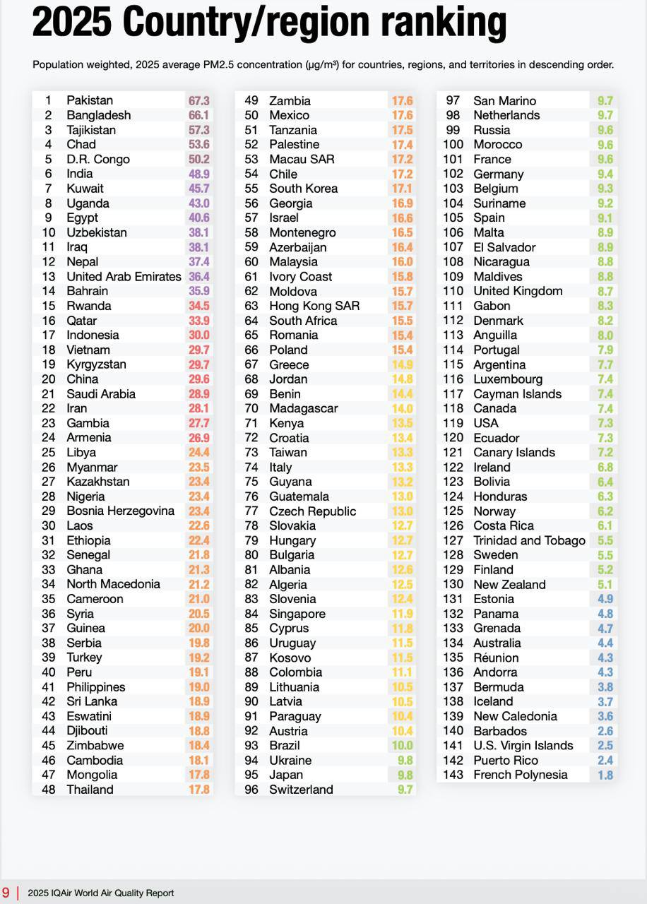 Наиболее загрязненными странами признаны Пакистан, Бангладеш, Таджикистан, Чад и Демократическая Республика Конго. Армения в списке соседствует с Гамбией, Ираном, Ливией, Мьянмой, Казахстаном, Нигерией, Боснией и Герцеговиной. Среди соседних государств Турция заняла 39‑е место, Грузия – 56‑е, Азербайджан – 59‑е. Ереван в рейтинге столиц находится рядом с Тегераном, Пекином, Вьентьяном, Манилой и Банжулом.