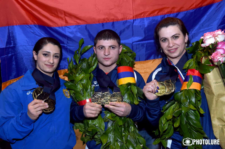 СПОРТԱյսօր լուսադեմին Երևան ժամանեցին ոսկե մեդալներ նվաճած հայ ծանրամարտիկները։ Օդանավակայանում չեմպիոններին դիմավորել էին եկել Սպորտի նախարար Գաբրիել Ղազարյանը, ՀԱՕԿ նախագահ Գագիկ Ծառուկյանն ու բազմաթիվ երկրպագուներ: