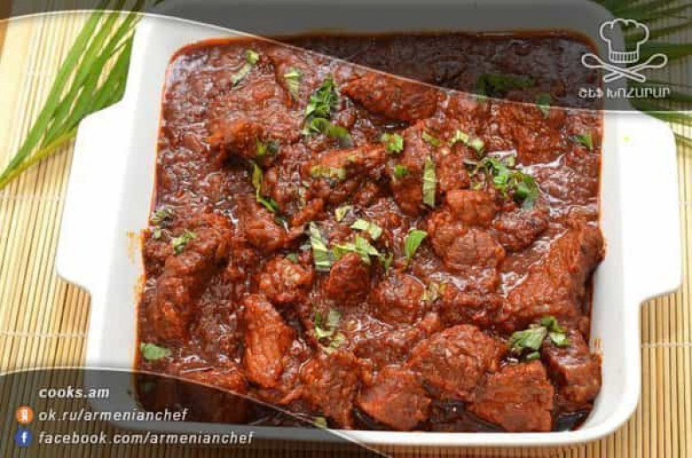 Թողնում ենք, որ զանգվածը եռա, ապա թուլացնում ենք կրակը, ավելացնում ենք կտրատված միսը և եփում ևս 1,5 ժամ առանց կափարիչի: