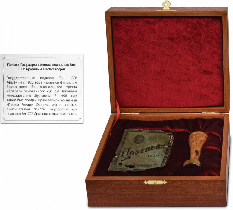 ՀԽՍՀ գինու պետական մառանների կնիք (1920-ականներ): Մառանները առևտրական Նիկոլայ Շուստովի հիմնած՝ Երևանի «Արարատ» գինու և կոնյակի կոմբինատի (1922) մասնաճյուղերն էին: Գործարանը 1998-ին վաճառվեց ֆրանսիական «Պեռնո Ռիկար» ընկերությանը։ ՀԽՍՀ պետական գինու մառանների բնօրինակ կնիքը պահպանվում է ՌԴ-ում։